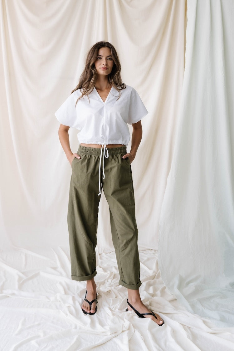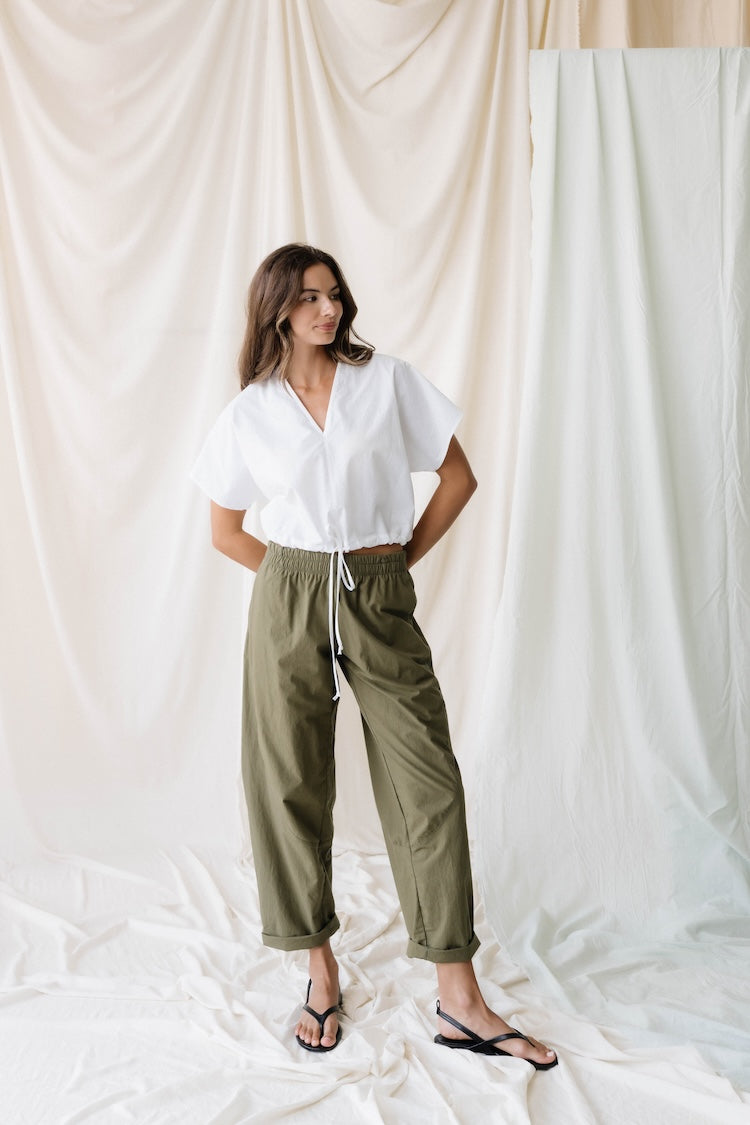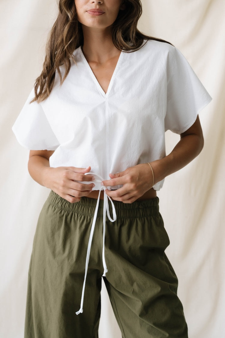 The Scoop: Looking for a stylish top you can style your way? We got you. Introducing our It's a Cinch Top! Featuring a drawstring waist that allows you to tailor the fit to your liking. Made from our favorite cotton poplin fabric, this top has V neckline with topstitch detail at the center front. Made through a special pretreatment and dyeing procedure in Japan, this cotton has a natural wrinkle and a soft, luxe hand. Cropped fit to pair perfectly with our Elastic Barrel Pant or Chill Pant!