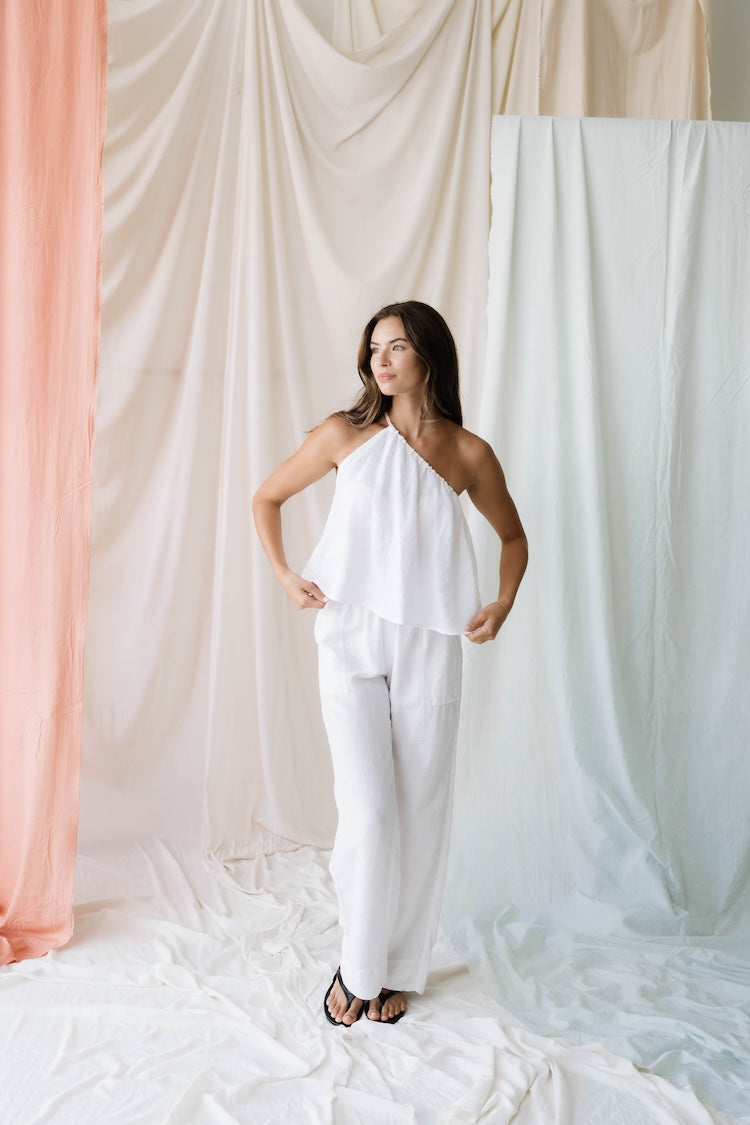 The Scoop: The Once Again Tank is the perfect flirty one-shoulder top for your wardrobe this spring! Featuring a shoulder tie that is completely adjustable, the flowing silhouette of 100% linen will make any outfit feel light and feminine.